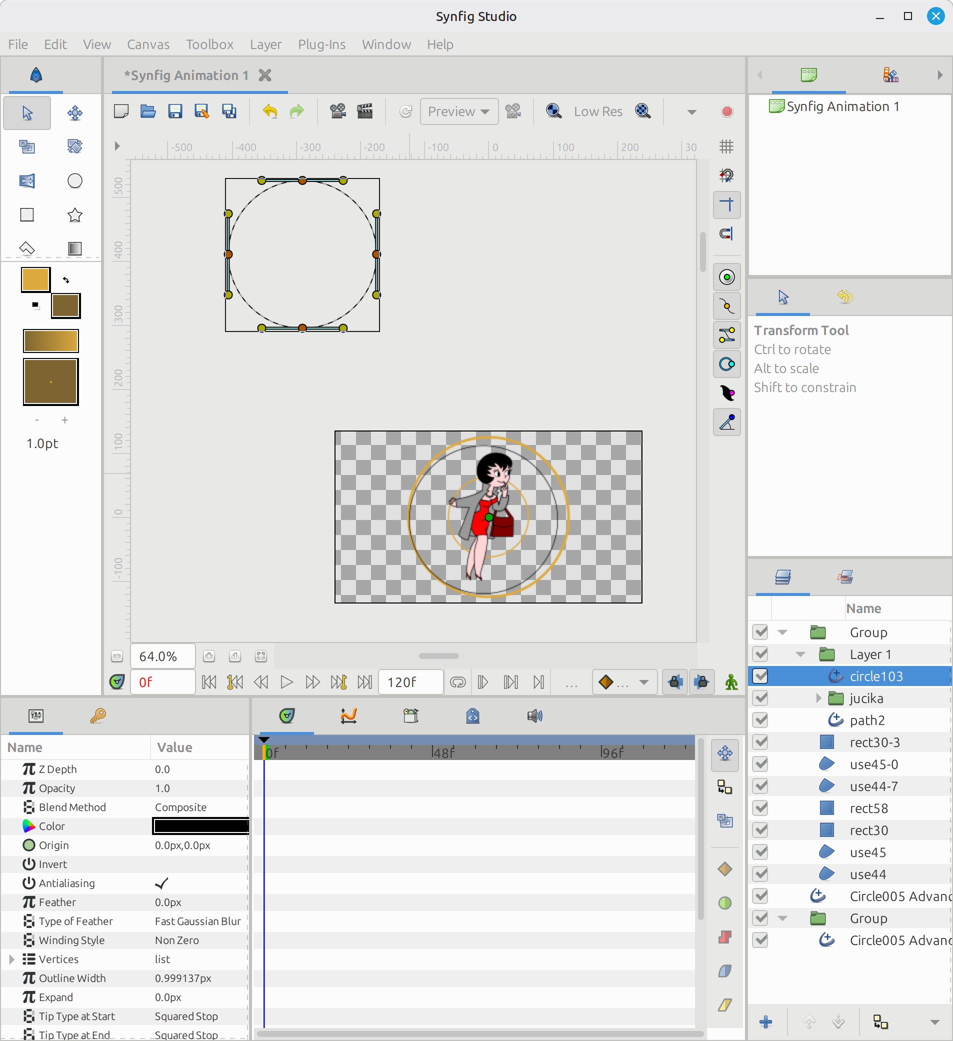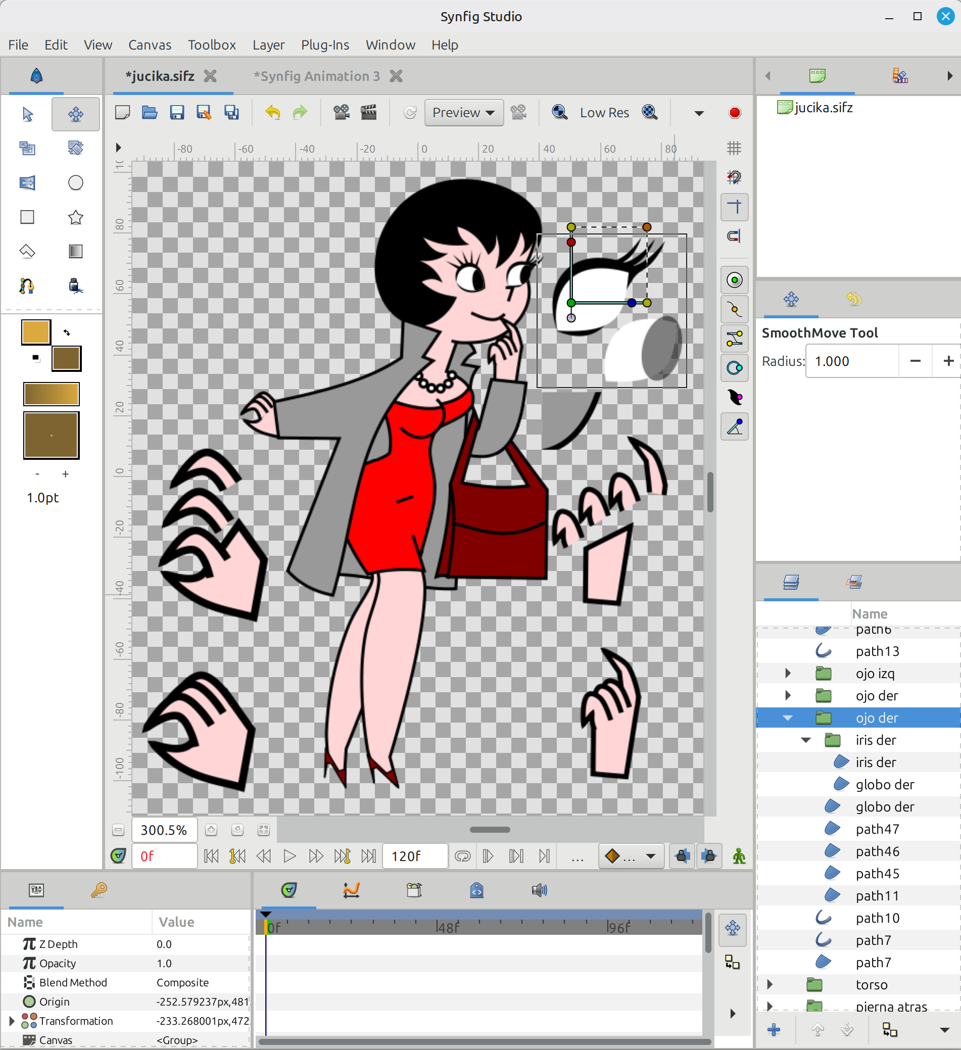 I just learnt that I can do the “invisible edge” technique in Synfig too. Next time I will try doing this work in Synfig… because relocating the origin of the scale/move axis might become unmanageable for many objects. On the other hand, I used Inkscape path effects to do the eyelashes and pearl necklace (and in general all the repetitive shapes).